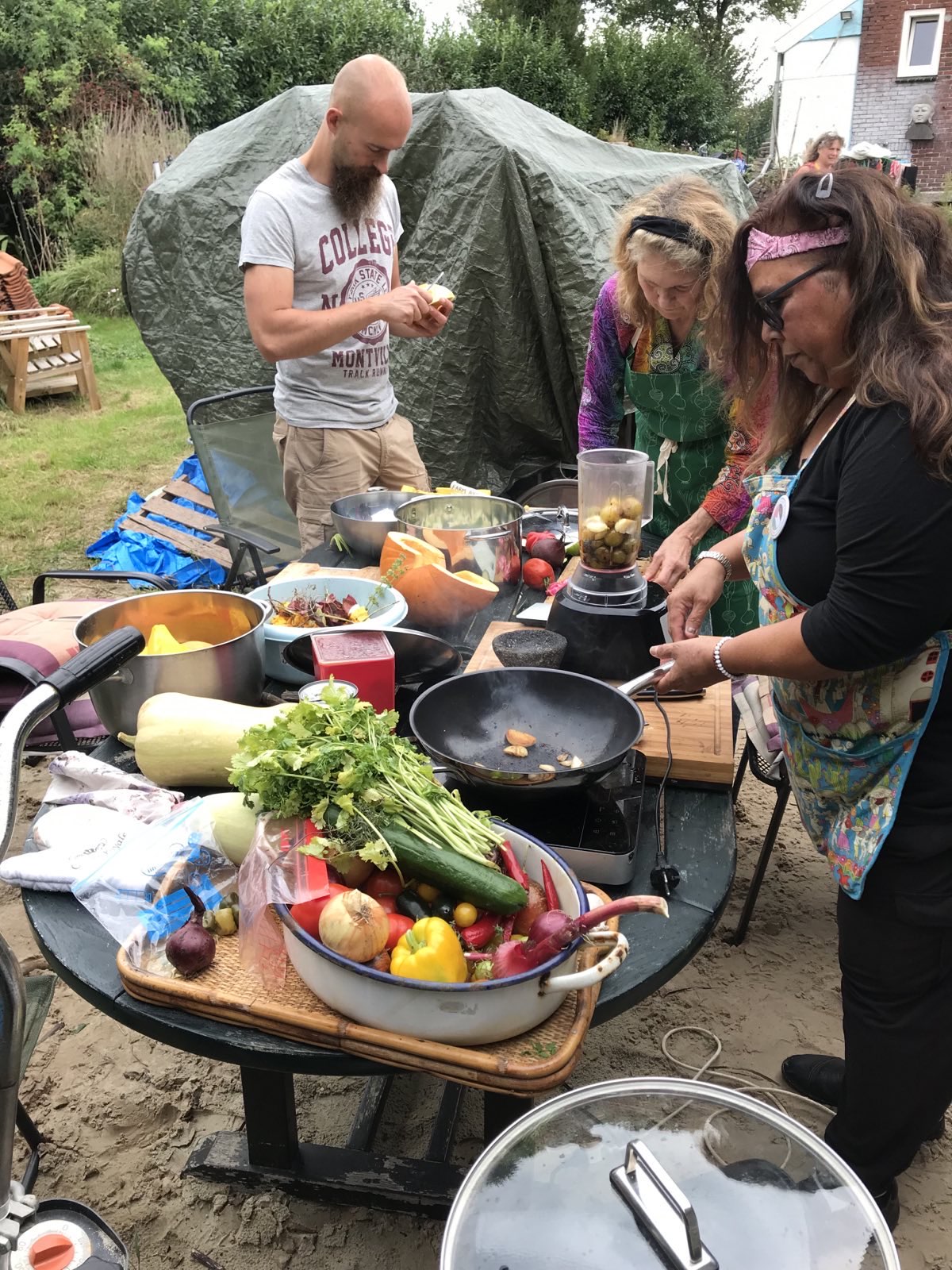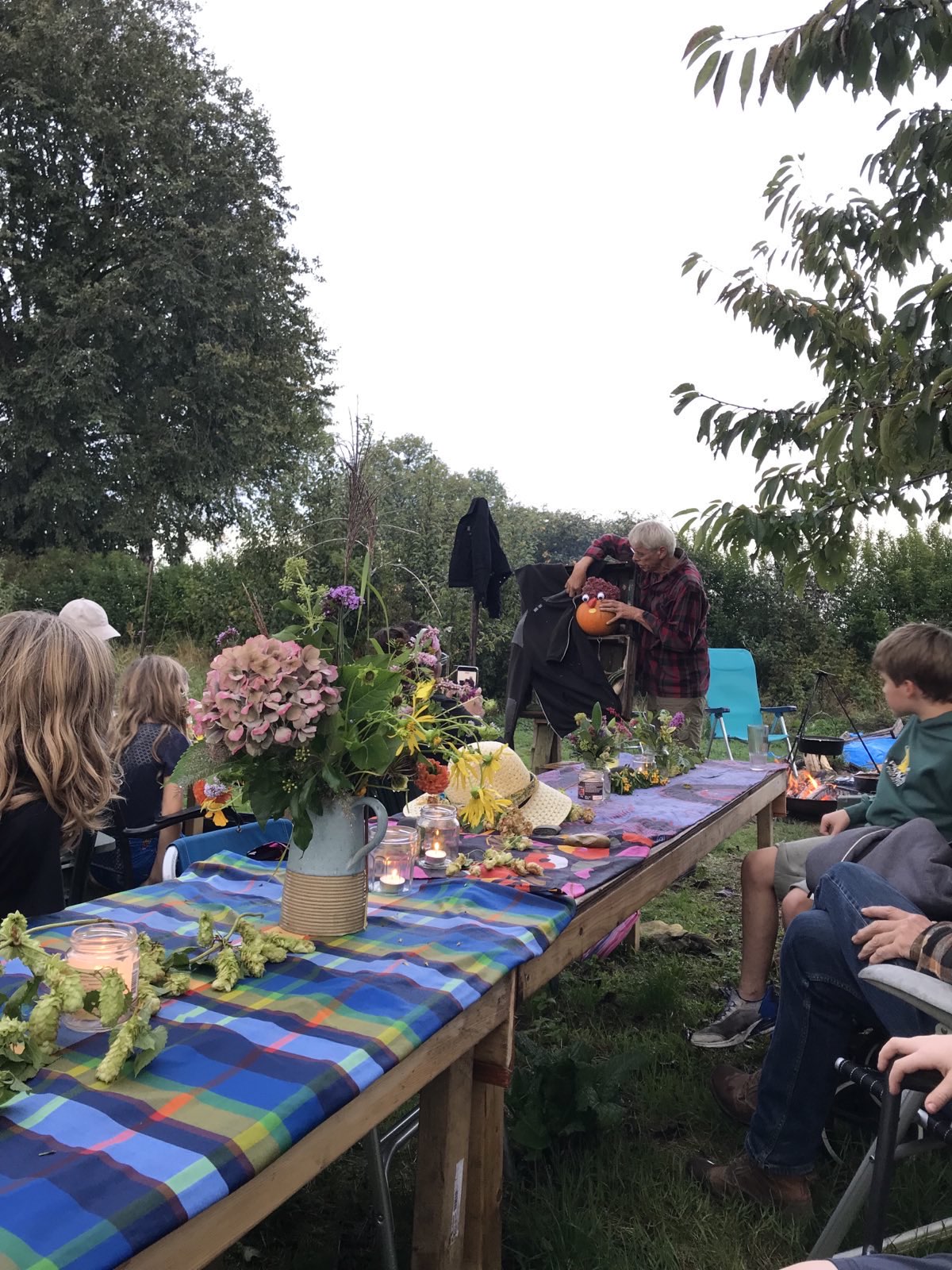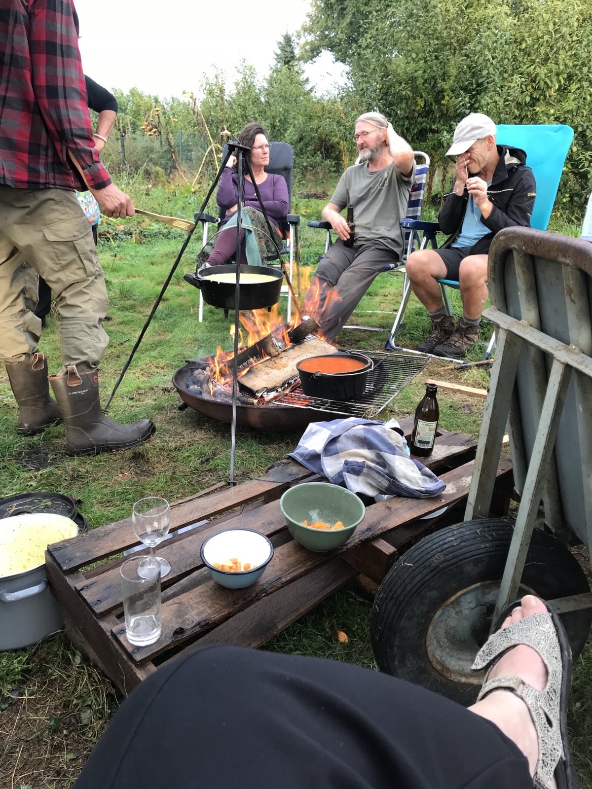 Dit septemberfeestje was een nieuw concept. Niet dat de potlucks van de twee voorgaande jaren minder waren, maar ach, iets anders proberen is de moeite waard. We zijn dan ook benieuwd naar hoe iedereen het ervaren heeft. De organisatoren gaan hun deel nog evalueren en wie weet, komt er na gesprekken in de verschillende kringen iets voort dat de volgende keer nog leuker maakt. Niet alles was meteen super, maar wie niet waagt die niet wint. Er werden overdadig veel groentes ingebracht. Er werd, voorbereid en onvoorbereid, geweldig gekookt, er waren wat leuke verrassingen en we hebben tot de sterren aan de hemel stonden gekletst rond het vuur. Iedereen die meedeed aan de voorbereiding heeft met plezier keihard gewerkt. Benieuwd hoe dit verder gaat.