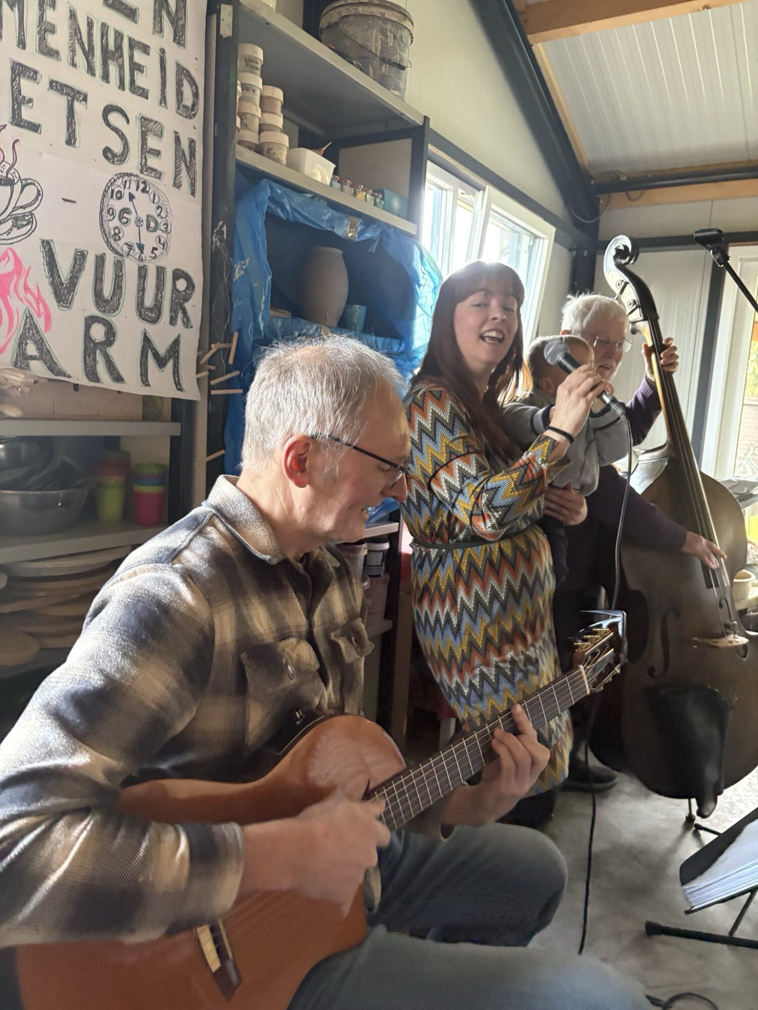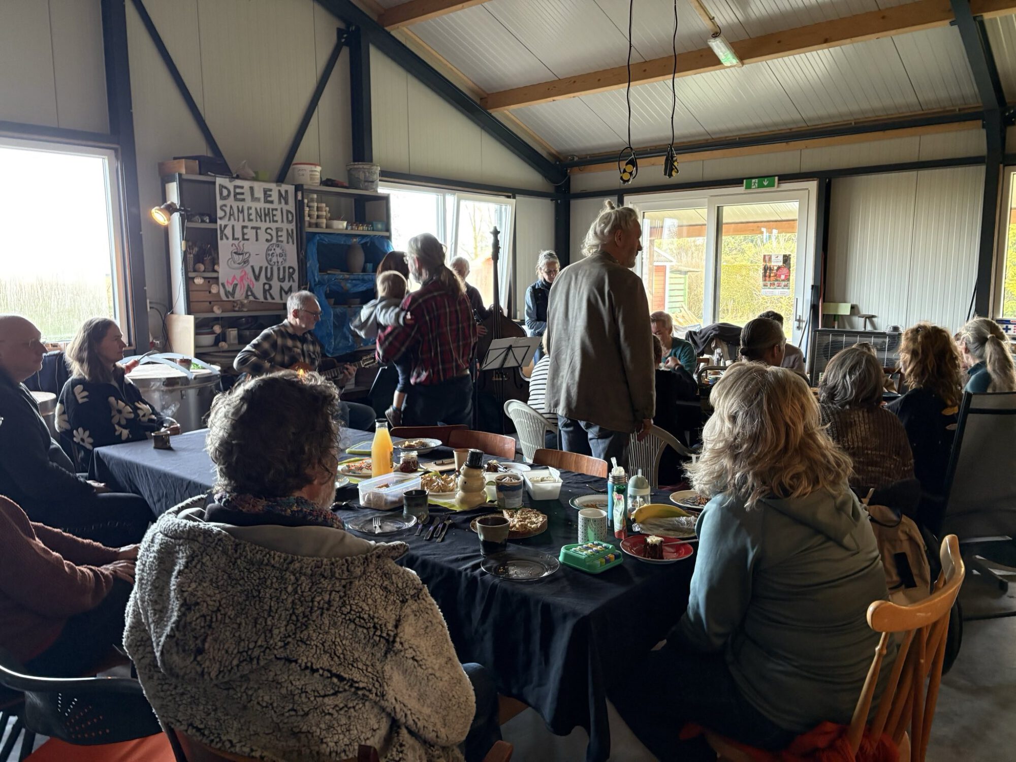 en een canon (Ik hou van delen…) waar iedereen aan mee kon doen. Donjalie, soms met zoon Dees op de arm, Bernard en Tom brachten een paar leuke, gedeeltelijk meezingliedjes ten gehore. Ook Annemiek op haar klarinet deed mee met Land van Maas en Waal oftewel Land van Westerwold. Al met al: feest!
